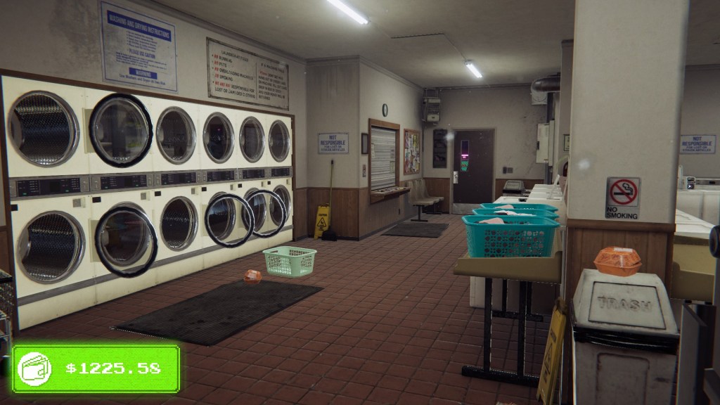 Your task in this game is to clean up the rubbish, remove the bubble-gum for money, put the rubbish bag in the dumpster for money, load up the washing machines, empty the washing machines for money and collect money from your machines.