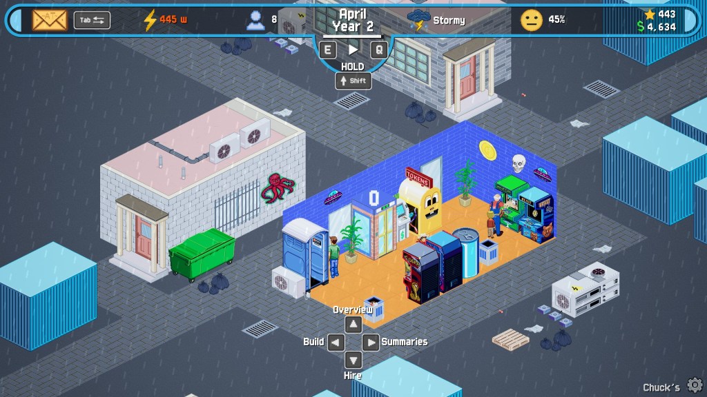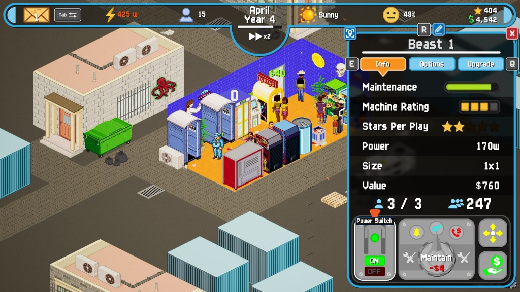 By right clicking on workers, customers, machines etc. you get stats, this is from one of the arcade machines, you can turn machines on or off, send in get them maintained, sell or move the machine and upgrade the machine which costs money and not stars.