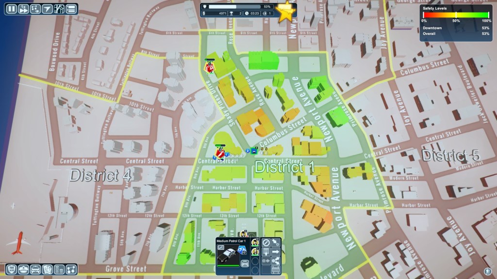 Patrols is what keeps your city safe, a motorcycle for example only requires one cop and you can set a patrol path for them, one flaw with this game is that the patrols can get stuck, and this impacts your ability to keep your score up high.