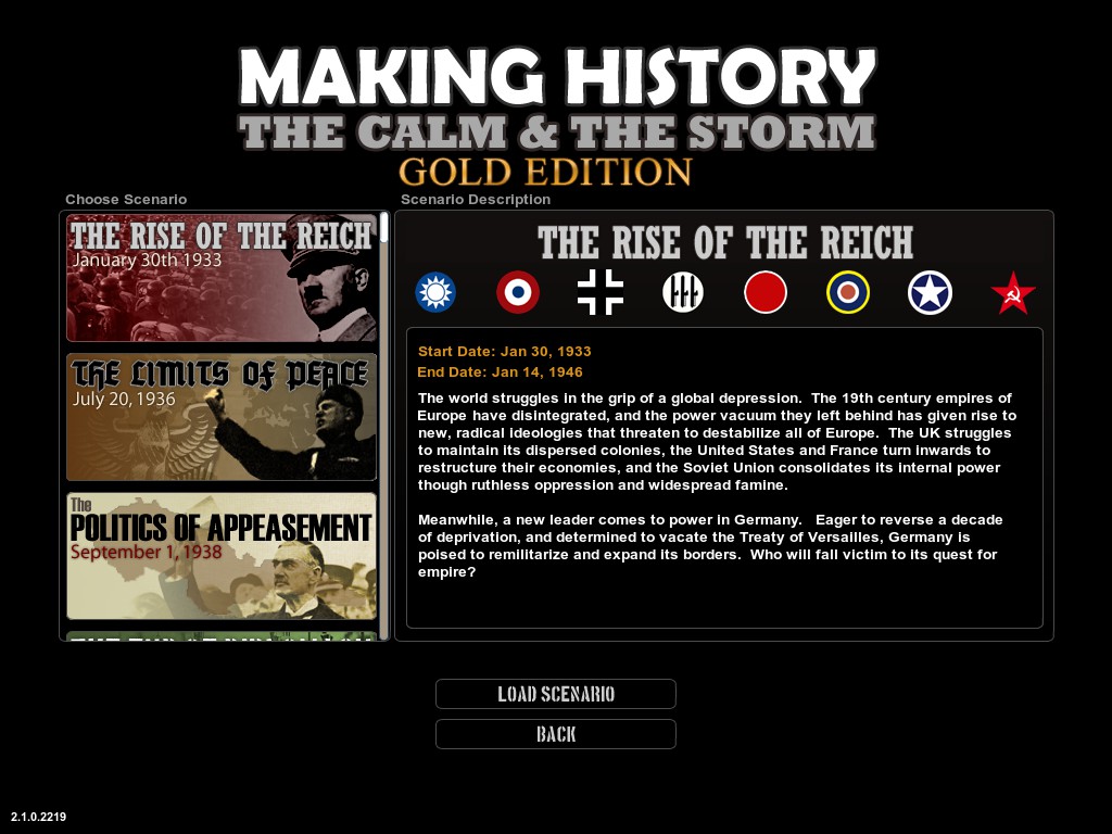 There are seven scenarios that take place from when the Nazis taken power in Germany until 1946 plus there are another three scenarios to choose from that features alternate history.