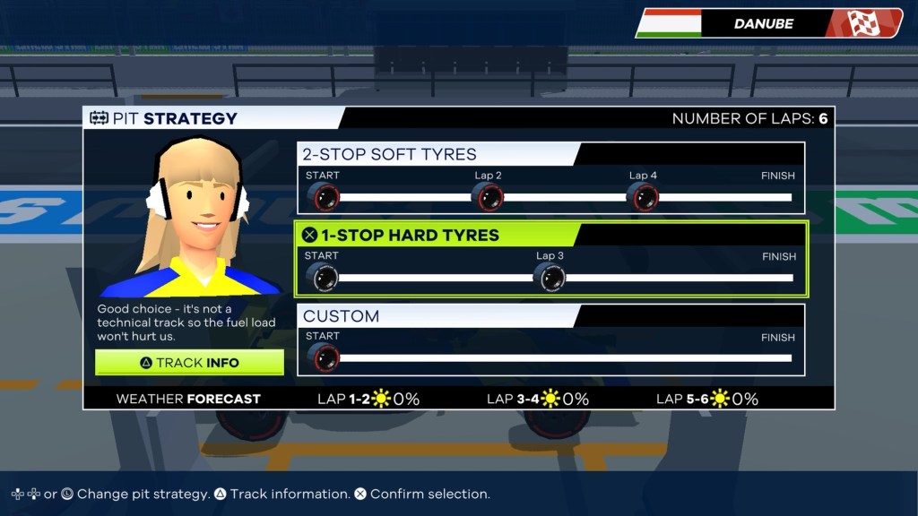 You can set a pit strategy, there are soft and hard tyres as well as wets, keep an eye on the weather forecast on the bottom of the screen to know what weather is expected and when.
