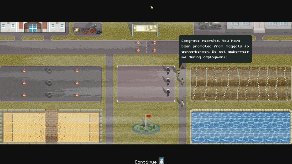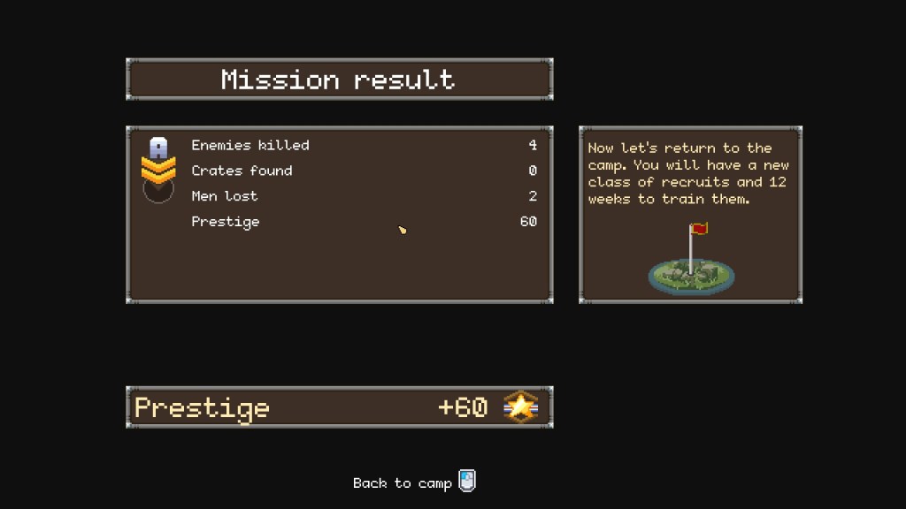 After your twelve weeks, your men graduate and it is time to send them on a mission, there are five missions to complete, and you can pull out after each one, you gain prestige, but you have to recruit new men, your surviving men can become assistants to you.