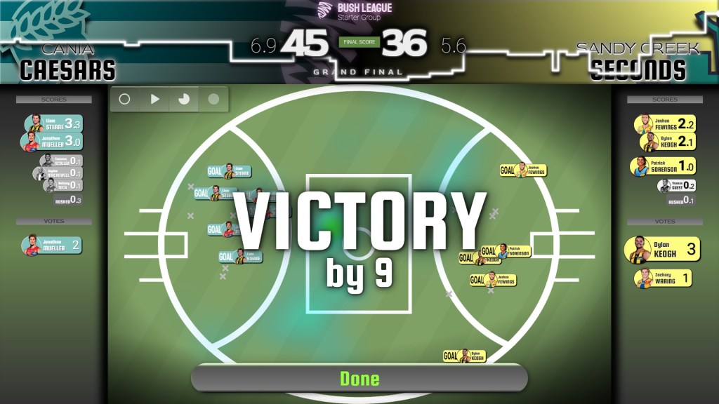 Now it is time to play some footy, sit back and relax and hope that you will get the above sort of screen, as you see my team won 6.9 – 45 to 5.6 – 36 for those not familiar with Australian Rules Football, the first number is goals, one goal is worth six points so six goals equals 36 points, the second number is points, each point is worth one so 9 points plus the 36 equals 45.