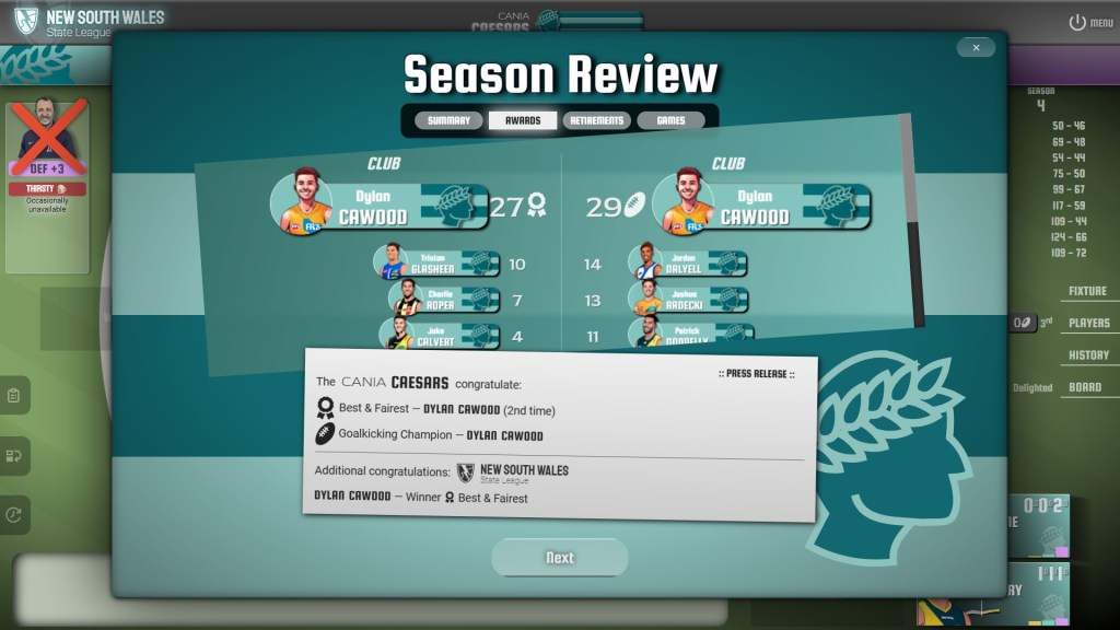 Eventually your season will come to an end either in regular season or in the finals, you are even a season review which includes a summary, awards for your players, player retirements and a rundown of all the games that season.