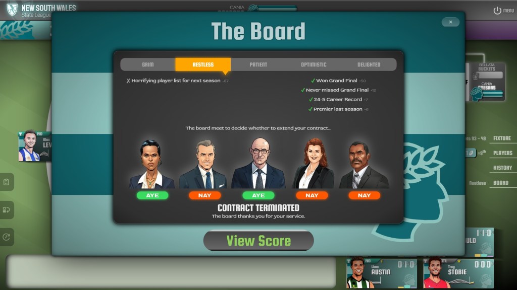 After the review comes the board meeting, while winning is important, you also have to satisfy the board of your club, you can be sacked for a variety of reasons, you could win too few games, or you could have too many player retirements weakening your team for next season.