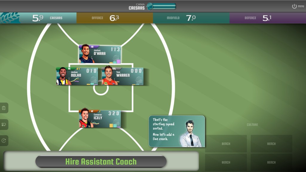 After you pick your initial team, you pick an assistant coach, and they have strengths and weaknesses and then you pick two game plans.