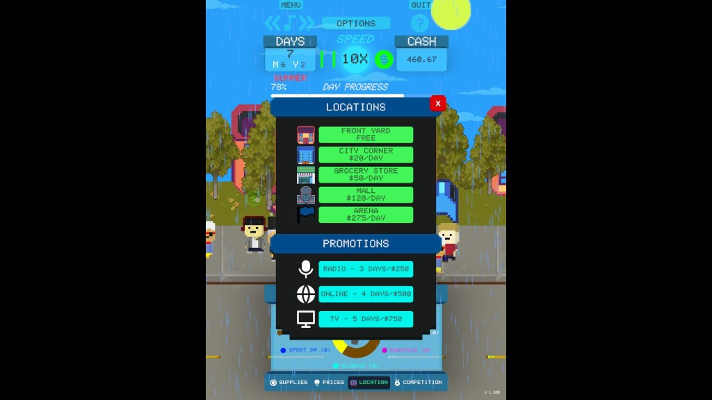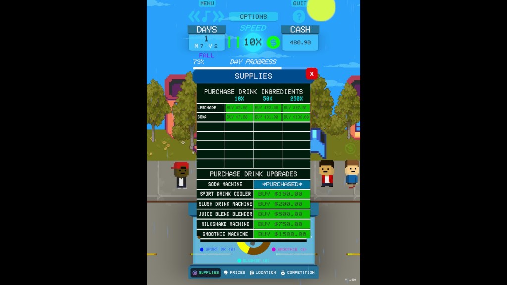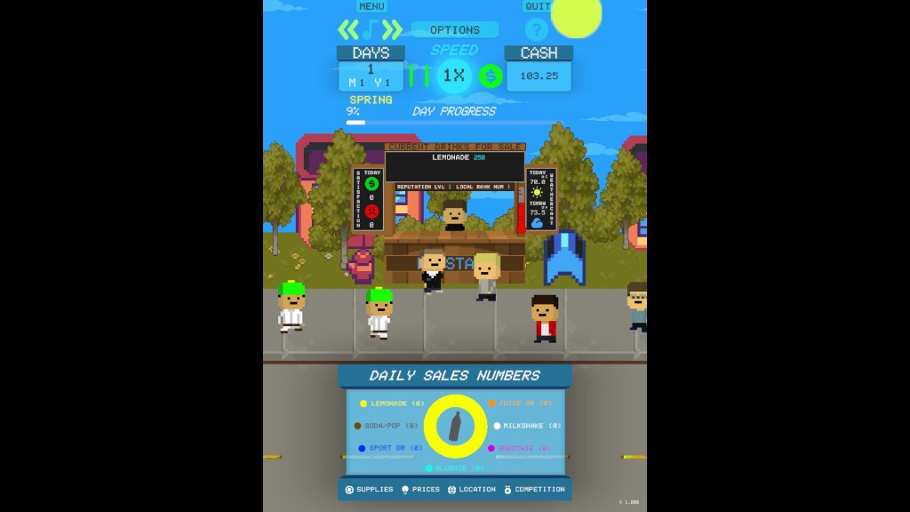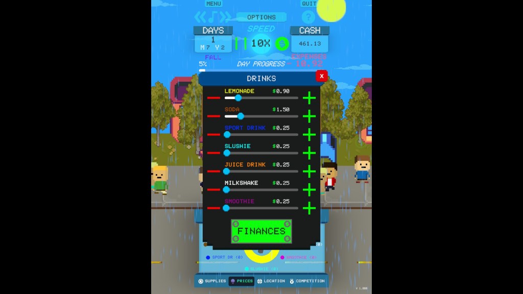 First things first, set your prices for drinks before you start buying your stock, for Lemonade I set my price at around $1 though you could probably push it up to $1.05 before customers get angry.
